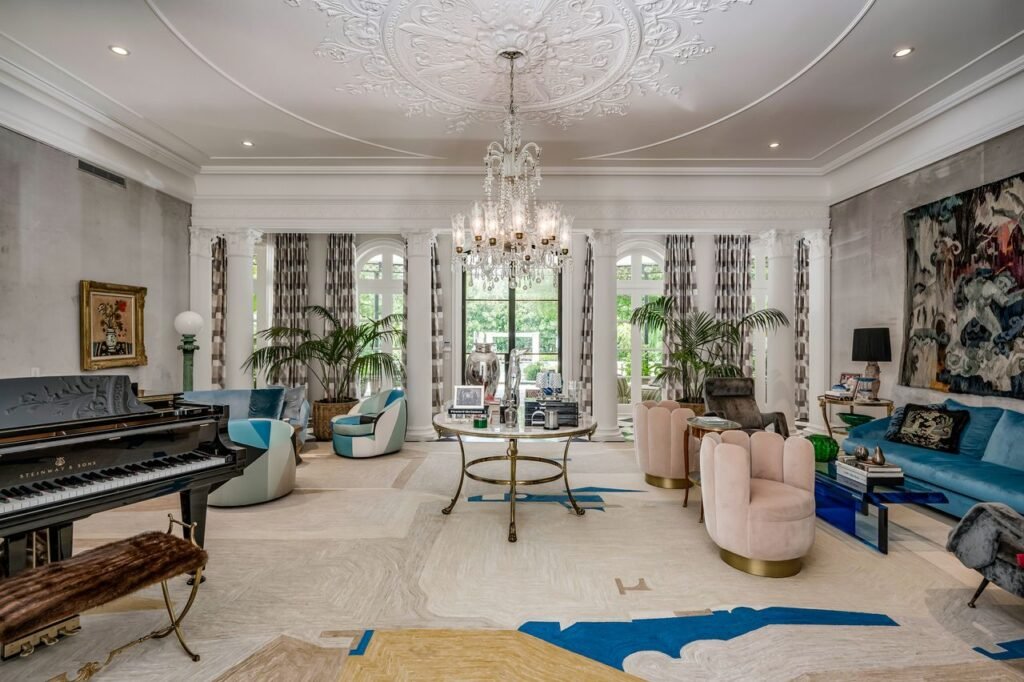 Stepping into this estate is akin to entering a European palace. Marie Antoinette statues grace the grounds, welcoming guests with an air of regality. Ornate ironwork, meticulously crafted, adorns the property, adding to the timeless allure. Trompe l’oeil, a painting technique that creates optical illusions, lends an enchanting depth to the interiors. Baccarat chandeliers cast a soft, ethereal glow, while antique fireplaces evoke a sense of history and grandeur.